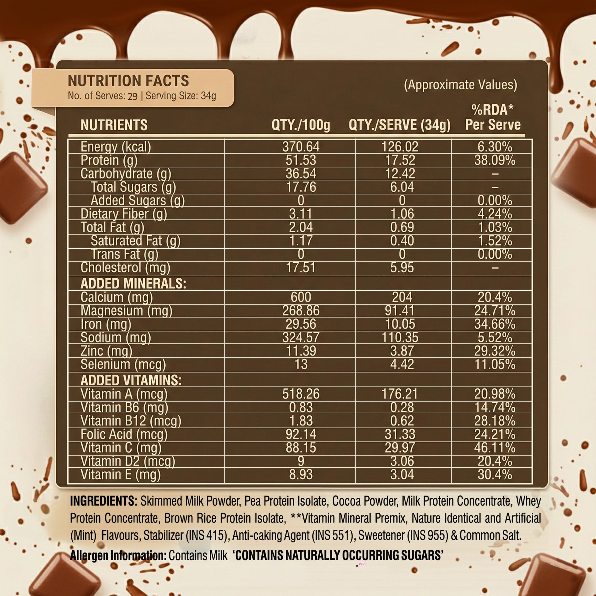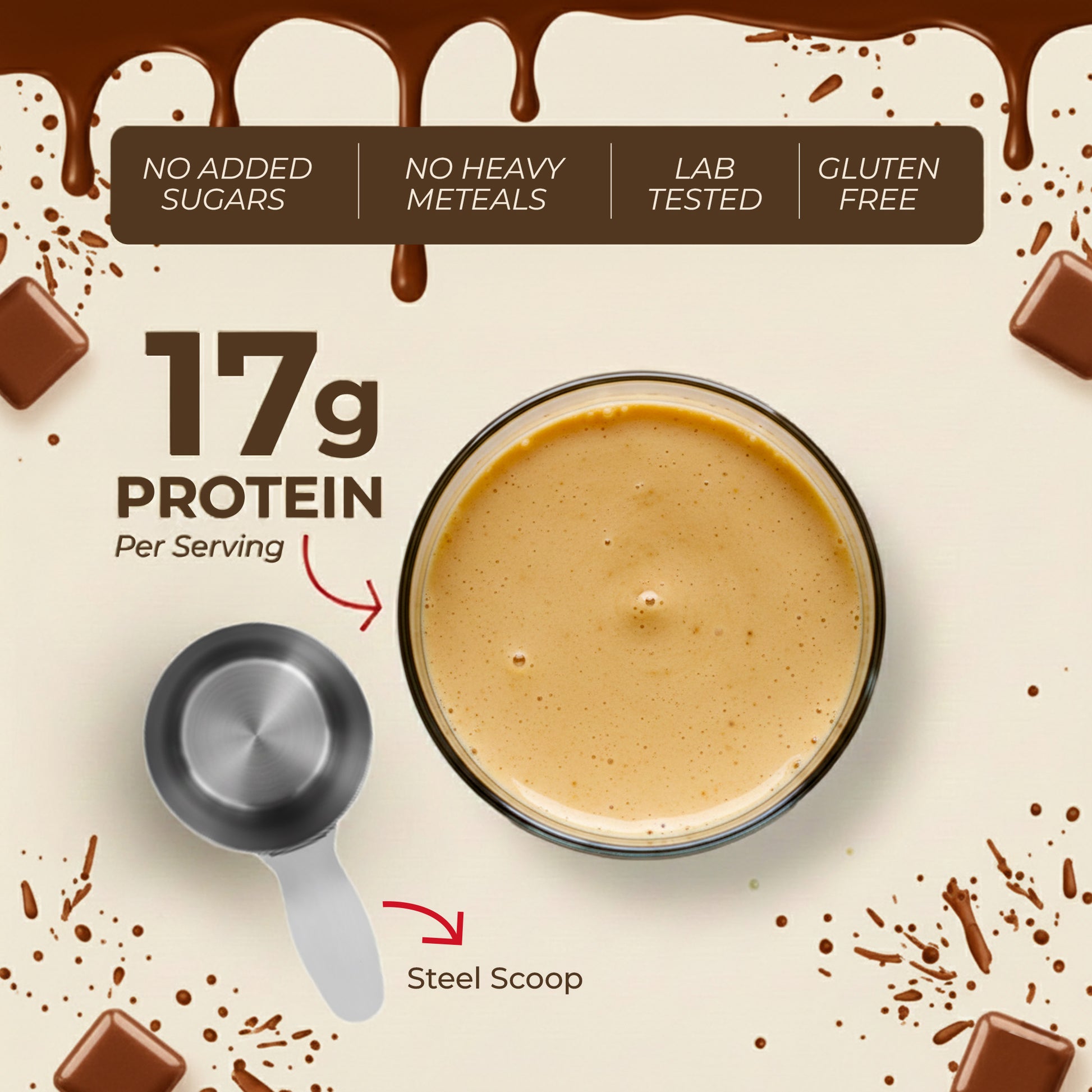 Each serving delivers 17g of high-quality protein, perfectly balanced with essential vitamins and minerals such as Calcium, Magnesium, Iron, Vitamin D, and Vitamin B12. This powerful combination supports muscle health, energy levels, immunity, and overall wellbeing.